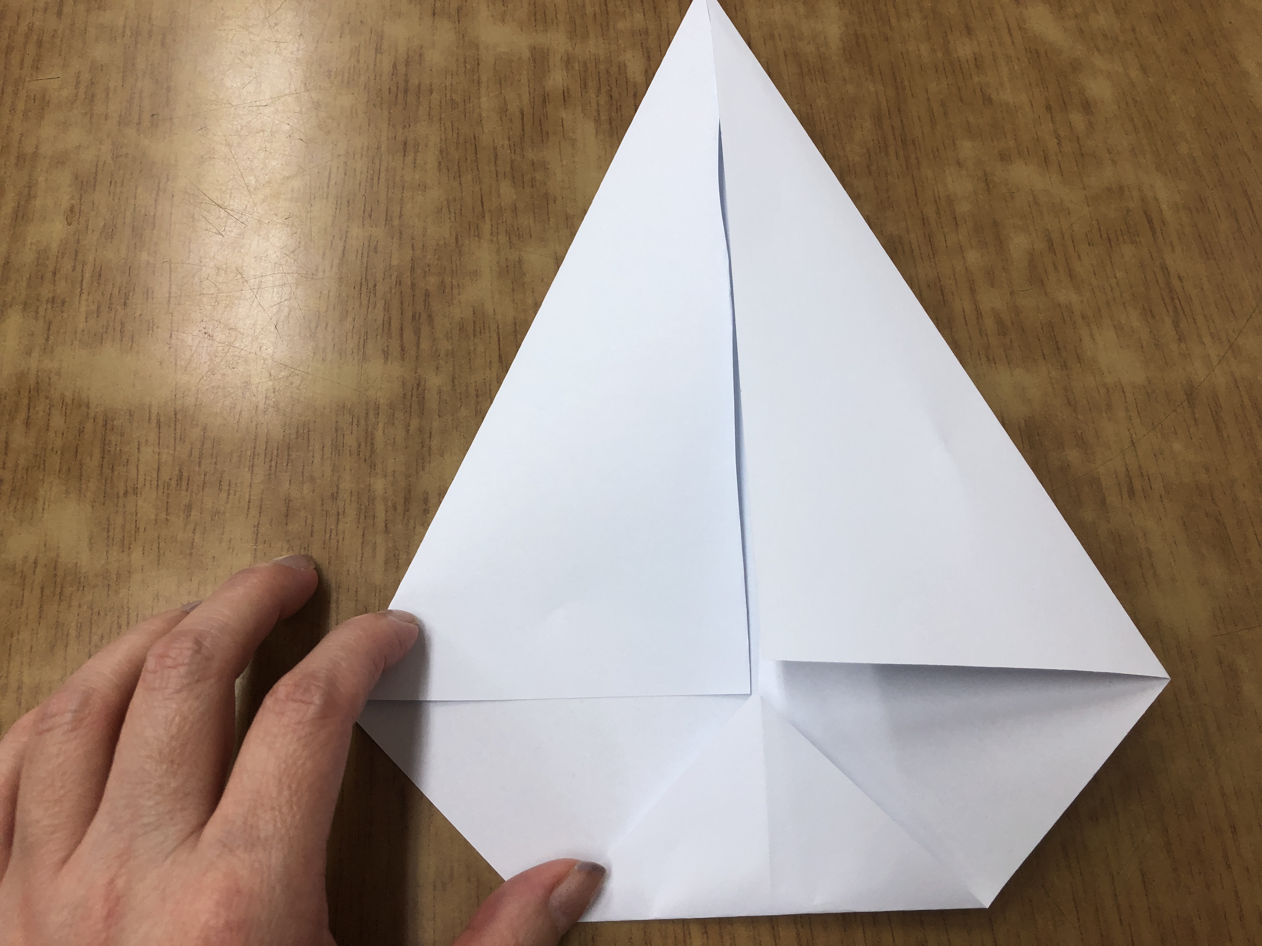- 정사각형 종이 가운데를 보면 대각선으로 접었던 자국이 있습니다. 이 자국을 기준으로 접어줍니다.