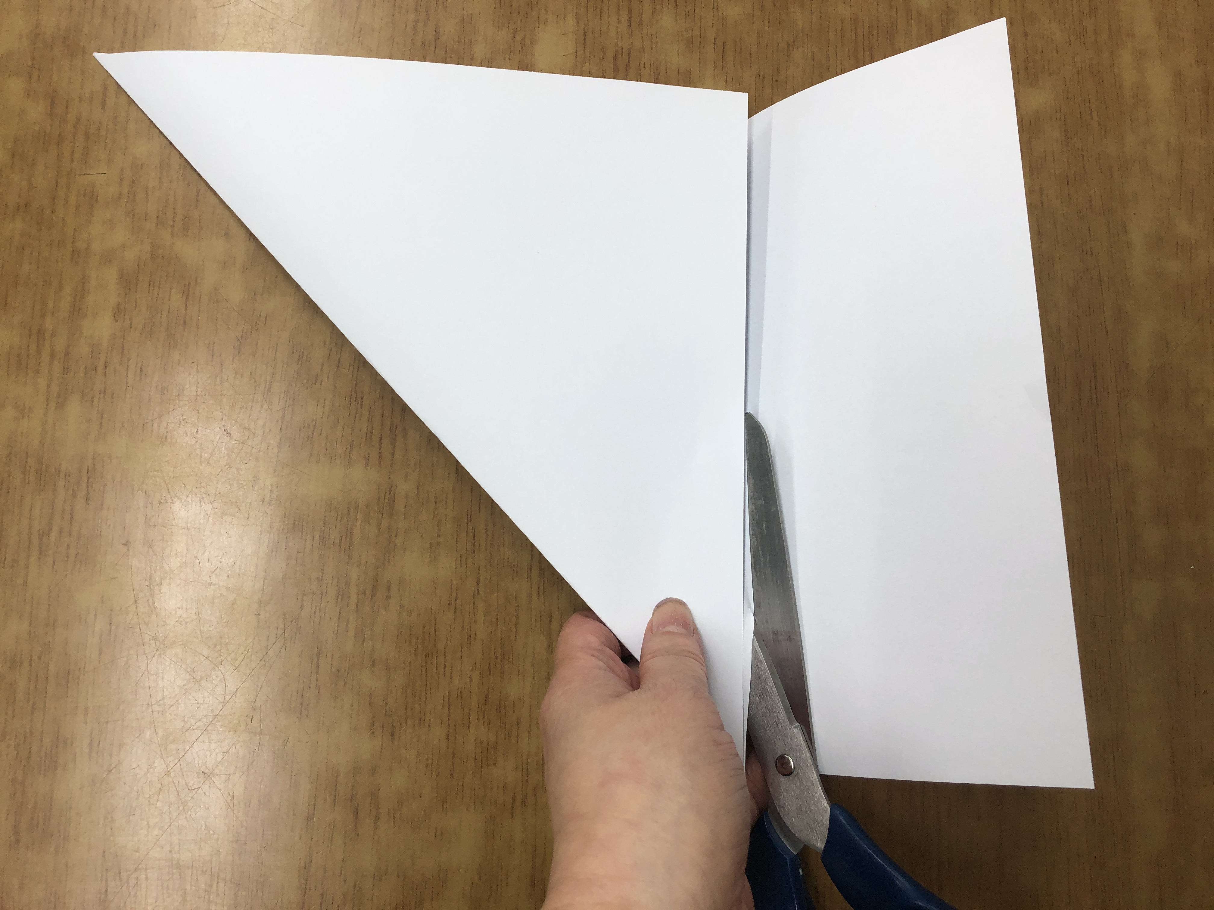 - 한쪽 모퉁이를 잡고 반대쪽 모서리에 붙여 세모를 접어준 다음, 선을 따라 자르면 정사각형이 됩니다.