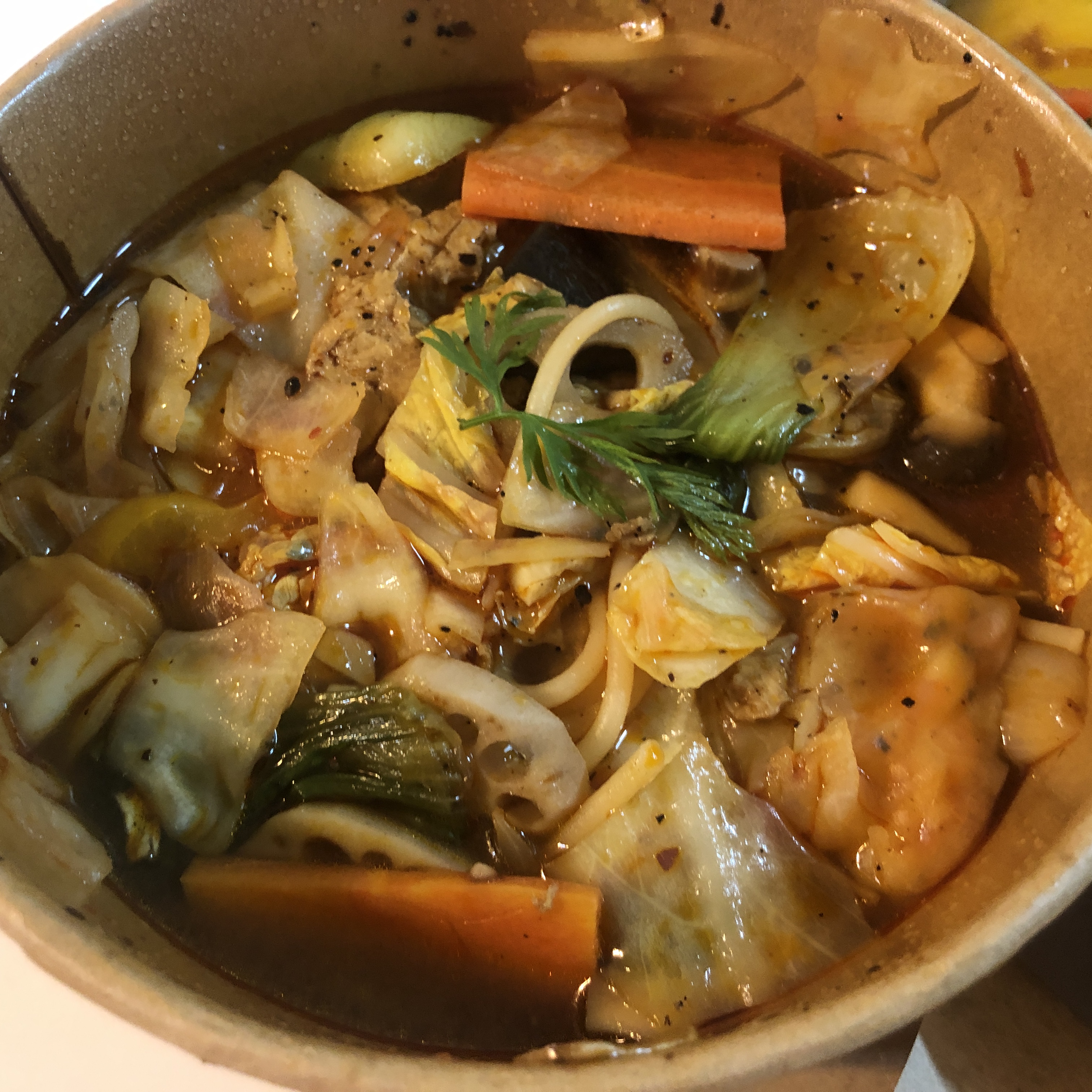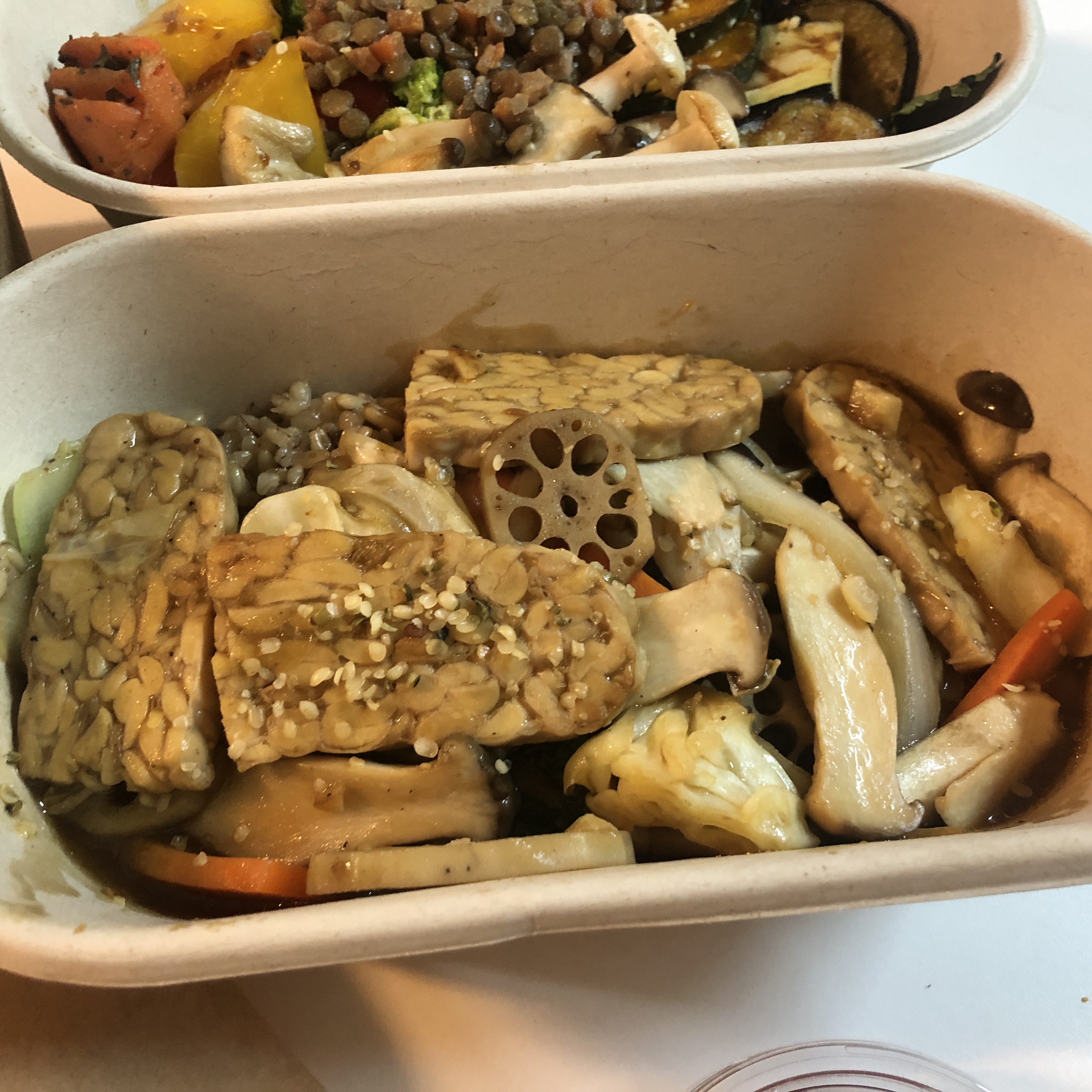 버섯, 양파, 당근, 청경채를 비롯한 연근 등 갖가지 채소가 들어있다. 맨 위에 콩엿처럼 보이는 것이 템페다. 콩으로 만든 인도네시아 발효 음식이라는데, 먹어보니 쫄깃한 치즈? 청국장? 느낌이었다. 맵지 않고 살짝 달크작작한 맛이라 매운 걸 못 먹는 사람에게 추천할만하다.
