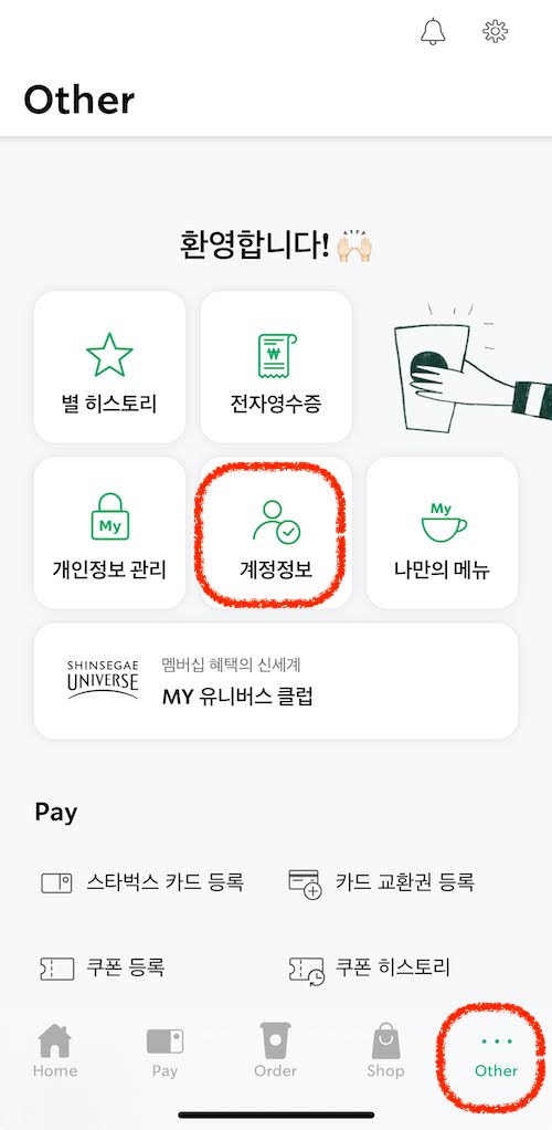 스마트폰에서 스타벅스 앱을 엽니다. 맨 아래쪽 메뉴에서 Other를 톡 터치하고 계정 정보를 선택합니다. 맨 아래쪽에 ‘탄소중립포인트제 설정’으로 들어가 본인인증을 완료하고 한국환경공단(환경부)의 ‘탄소중립 포인트 녹색생활실천’ 회원으로 가입하면 됩니다.