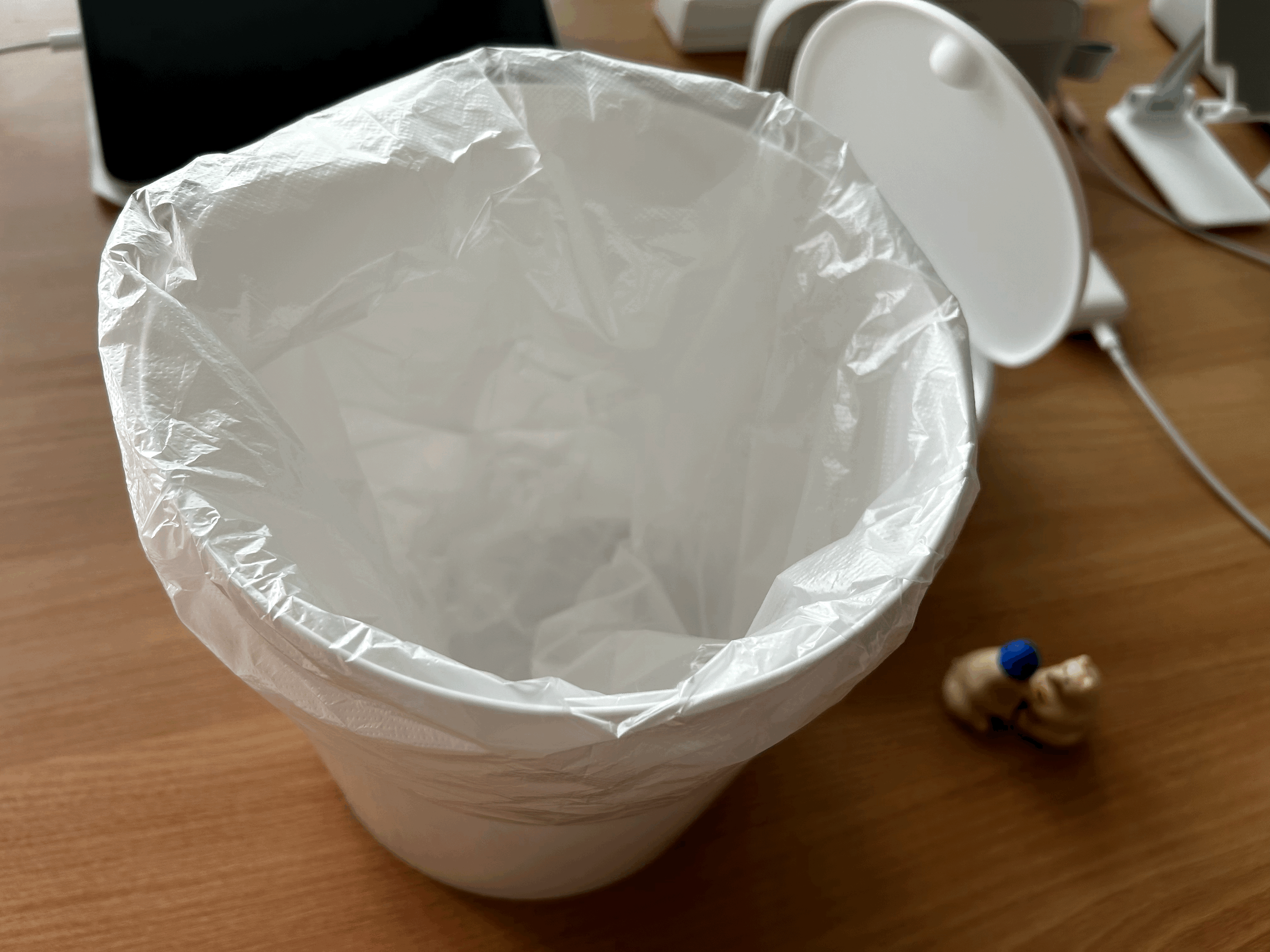 쓰레기통 안에 비닐을 넣어 보았다. 다이소에서 파는 대형 클랜백. 문제 없이 들어간다. 살짝 크긴 하지만. 중형 백은 안 들어간다. 길이는 맞는데 입구가 안 맞는다. 쓰레기통 입구가 비닐에 비해 넓다.