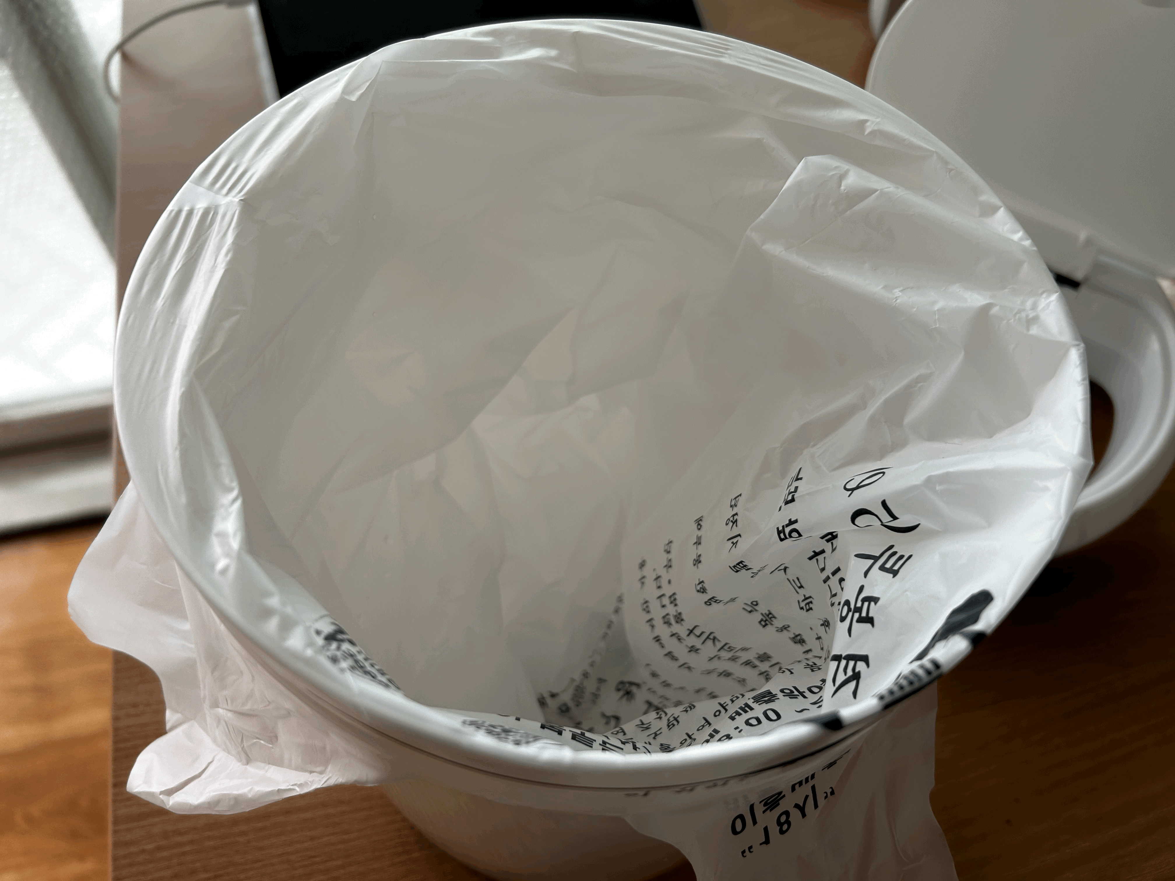 5리터짜리 종량제 봉투를 넣어 보았다. 빠듯하다. 살짝 봉투를 늘려줘야 한다. 그래도 쓰는 데는 별 문제없을 것 같긴 하다.