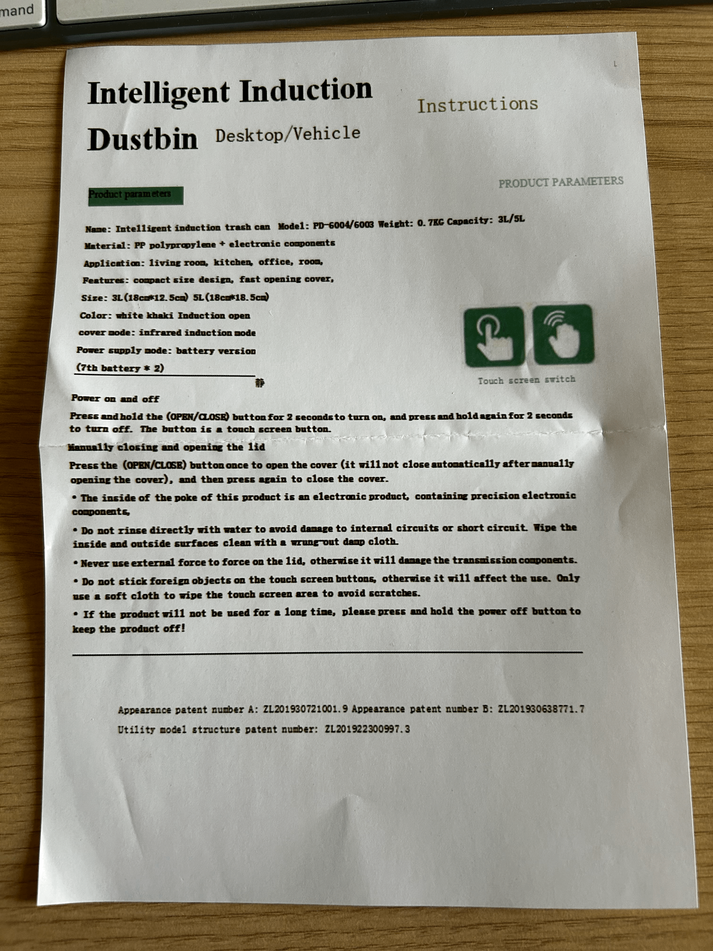 센서가 잘 작동하는지 알아보기 위해 건전지를 넣고 시험삼아 쓰레기를 넣어 보았다. 마침 버릴 게 없어 종이 냅킨을 구기고, 휴지통 사용 설명서도 넣는 시늉을 해 보았다. 잘 작동된다. 하지만 얘가 감지를 한 다음 열리기 때문에, 예전에 내가 발로 페달을 밟을 때보단 살짝 느린 느낌이 없지 않다.