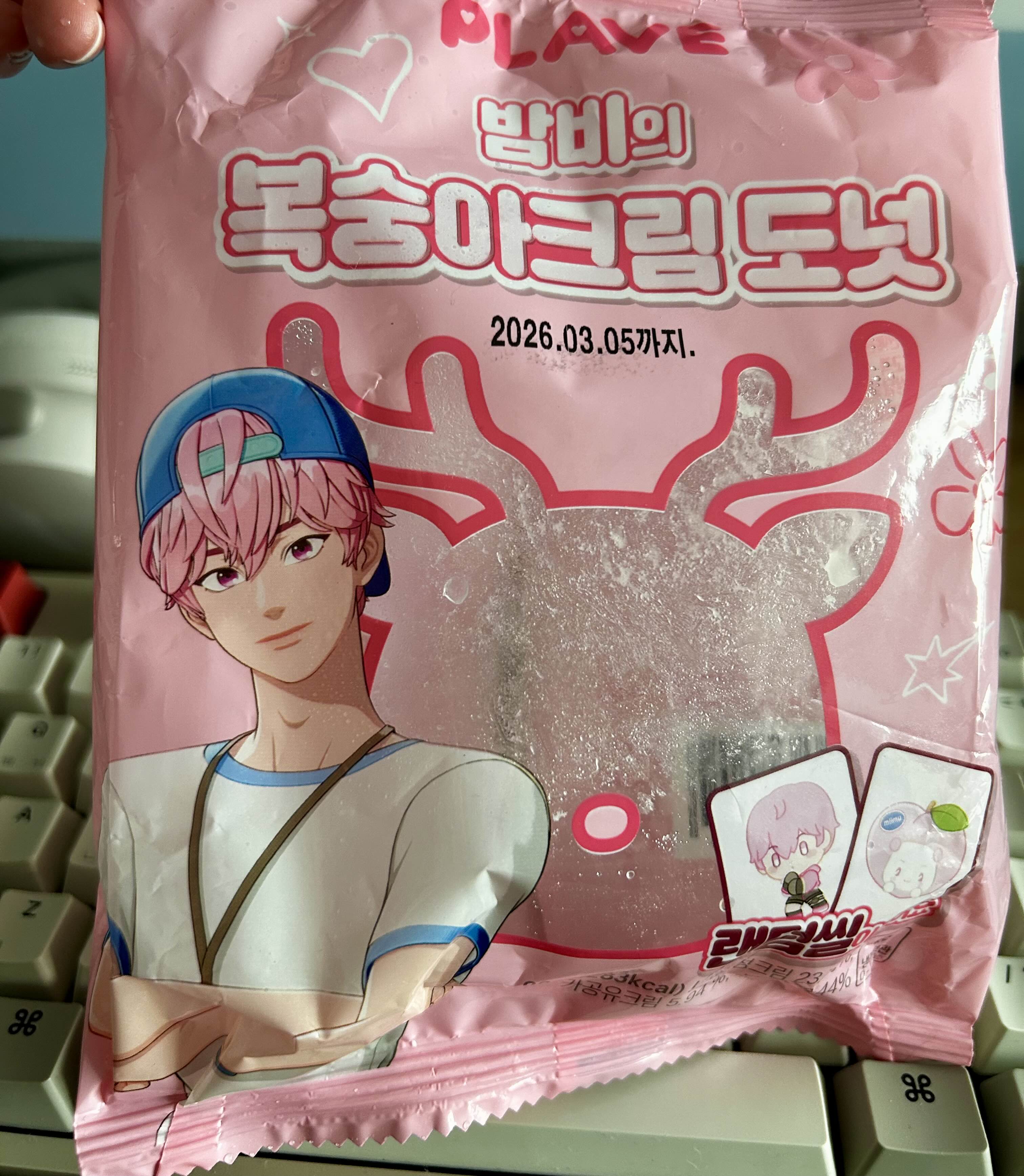 이 빵 이름은 '밤비의 복숭아크림 도넛'인데, 밤비라는 이름에 맞게 투명창이 사슴 모양입니다. 이 빵에 밤비라는 이름이 붙은 것은 플레이브 멤버 분홍 머리 봉구의 별명이 밤비이기 때문이죠. 머리 색에 맞춰 이름을 지었는지, 노란 머리 노아, 은빛머리 은호, 분홍머리 봉구... 이렇습니다. 나머지 두 명 하민과 예준은 까만 머리, 블루블랙 머리인데 그 둘은 머리색과 관련 없는 것 같기도 하네요. ㅎㅎ